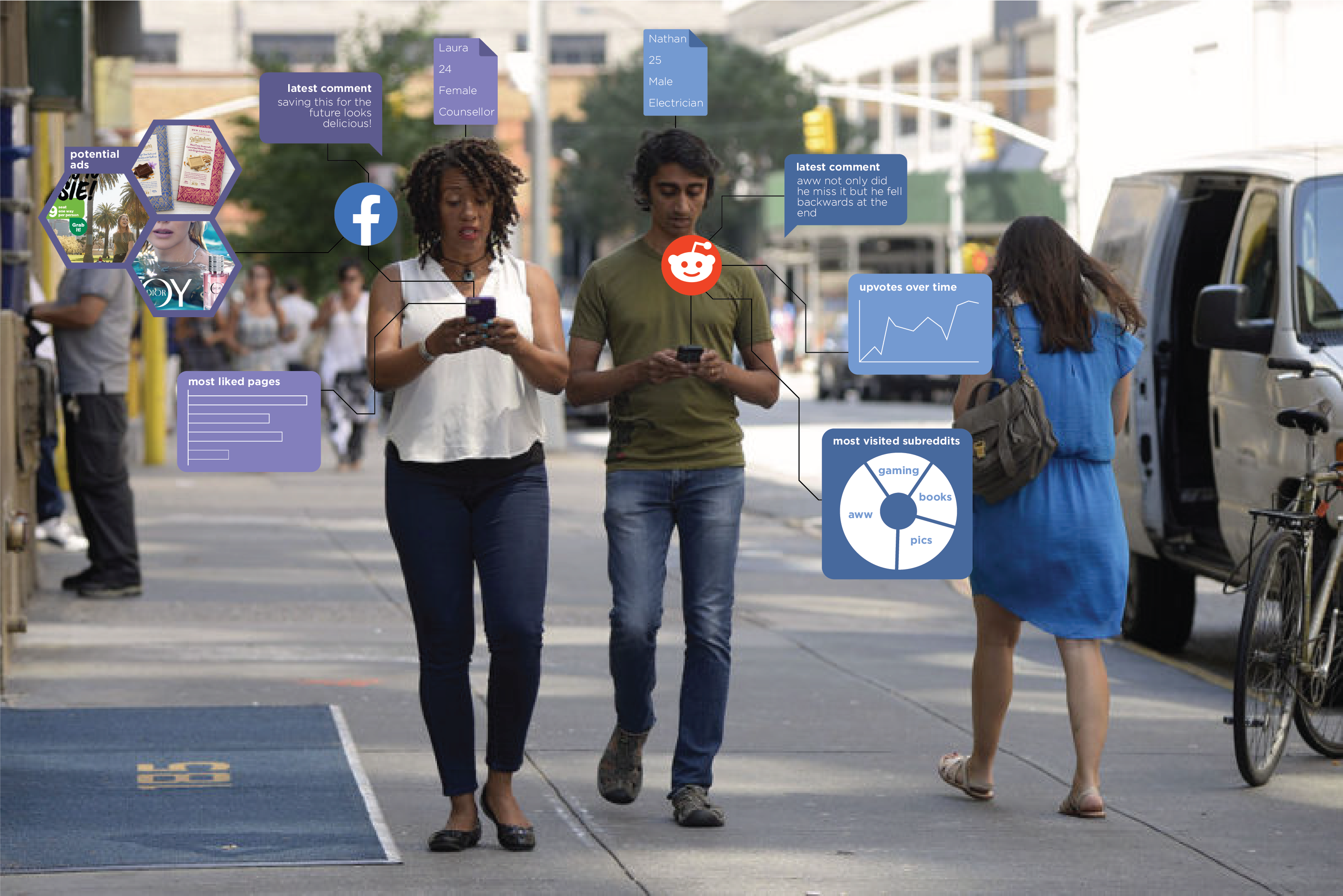 I am going to present these data traces through a physical trail that is seen through the eyes of the user. It will be displayed through an augmented reality implant that users can buy. The interface of the AR design will be futuristic and clean. There will be channels branching off user’s devices that connect to the internet, showing data they have input into various sites that is being unknowingly tracked. It will be similar to a map, where each piece of data that appears branches off into more pieces of information, detailing where that data goes and what it is used for.